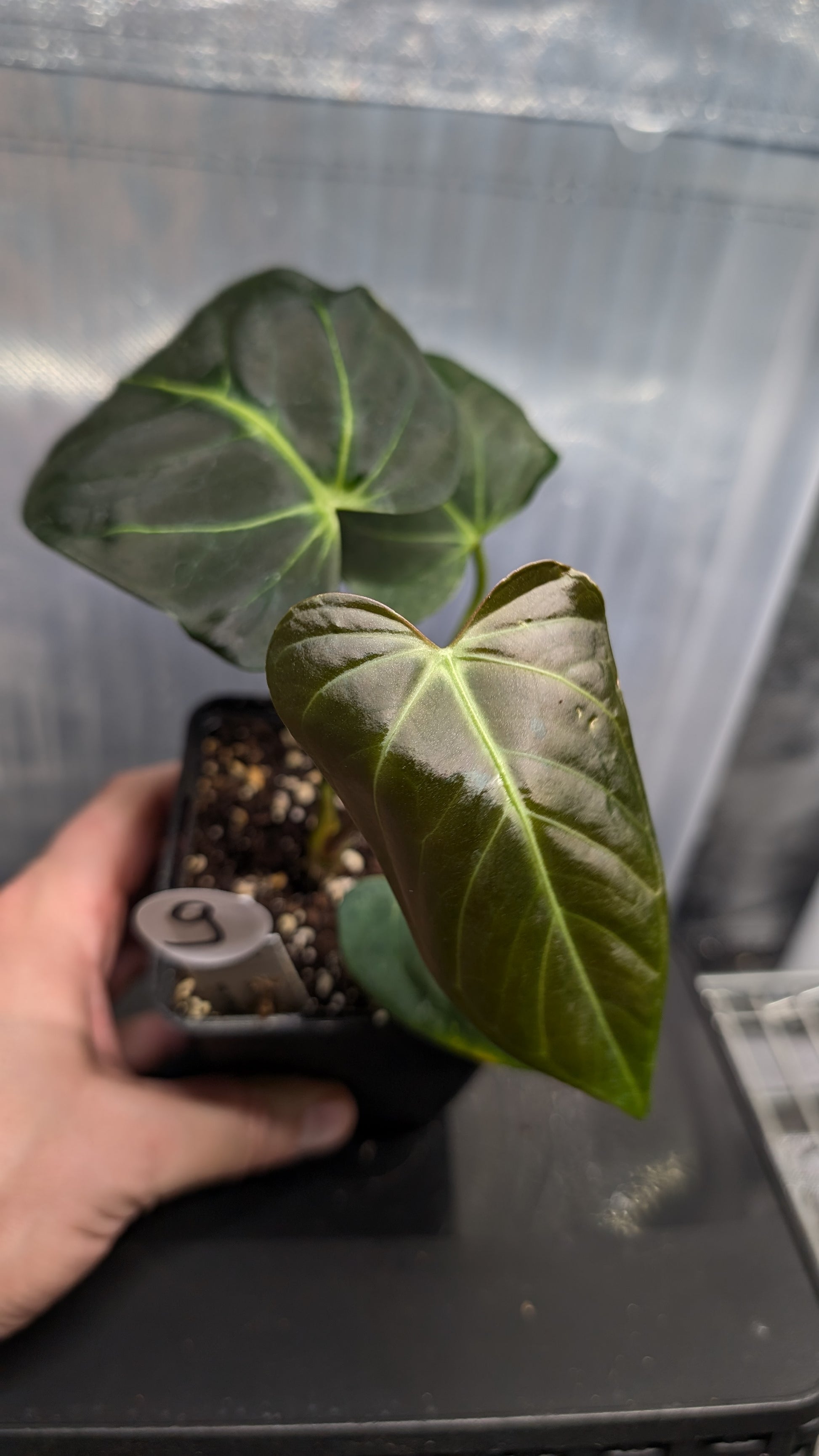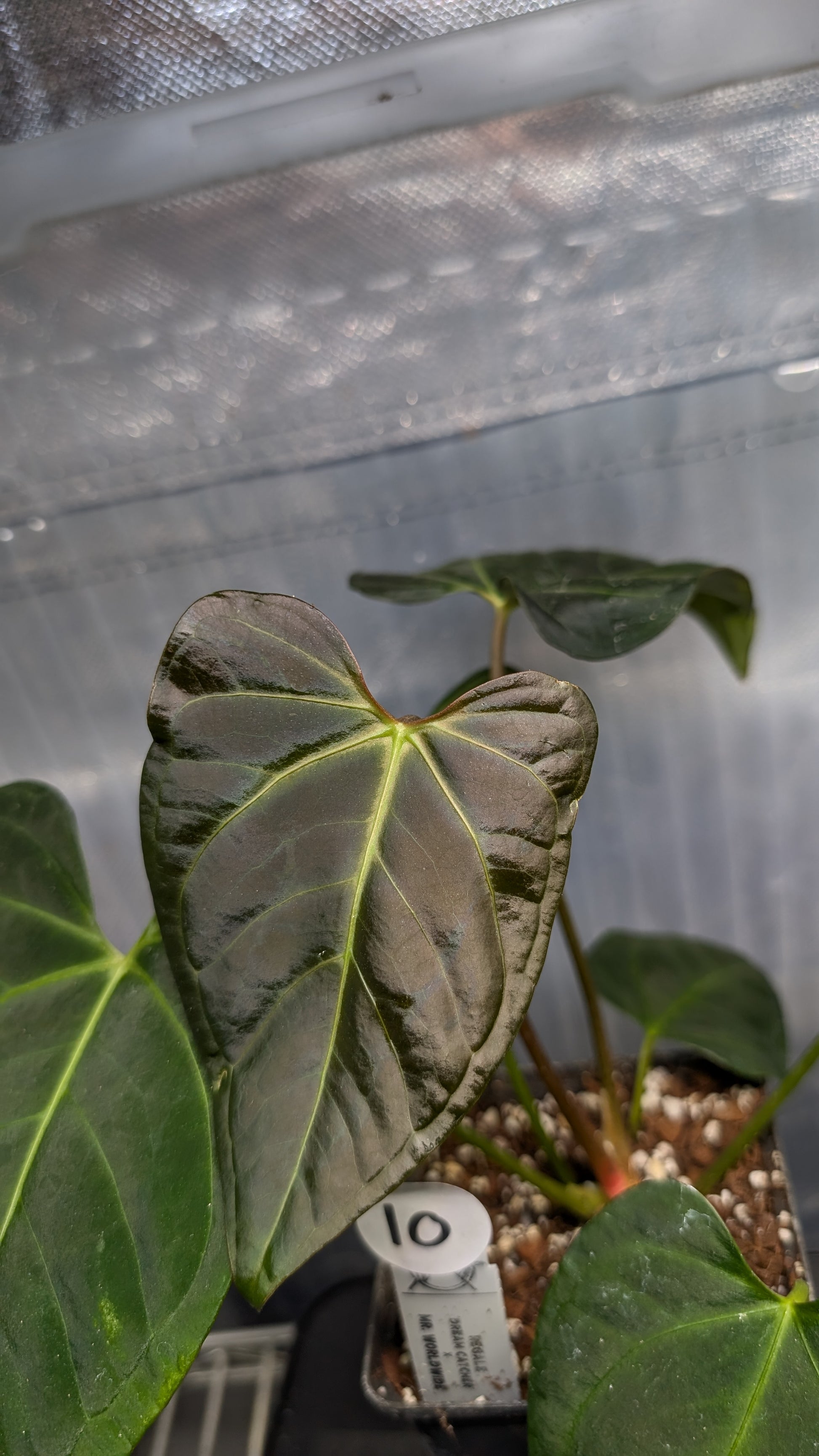 The pollen parent is Mr. Worldwide. It's a very sought after dark velvet triangular anthurium and sought after for the red-purple colors on the back of the leaf, the characteristic flat sinus and its rarity.