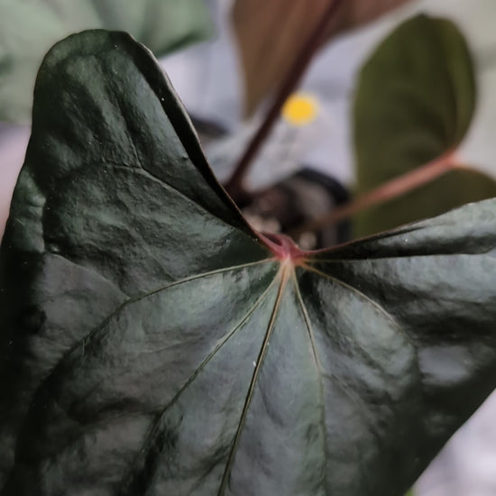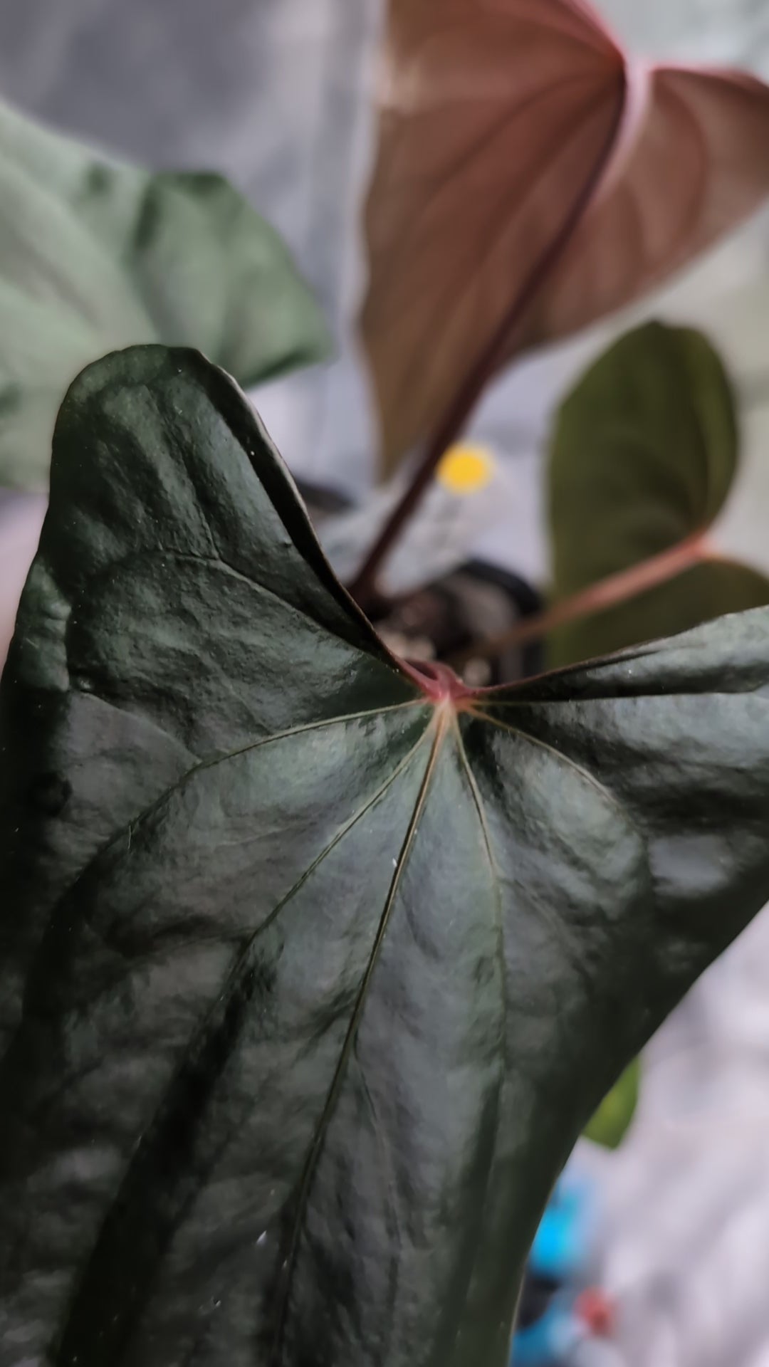 It was selected for its matte dark grey color (like Slate stone) and has a red sinus and geniculum which contrast amazingly against the dark grey/green leaf color.