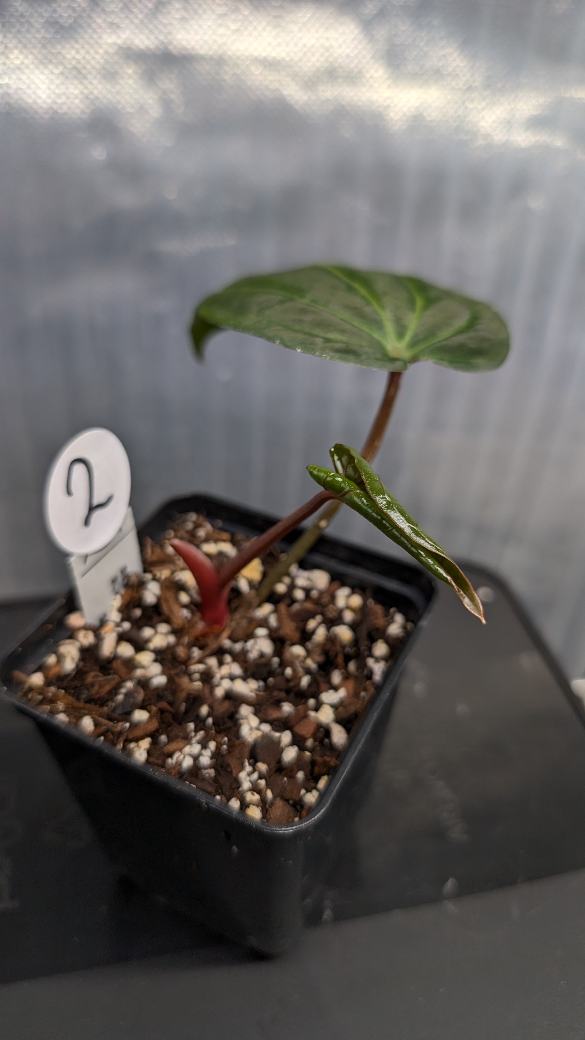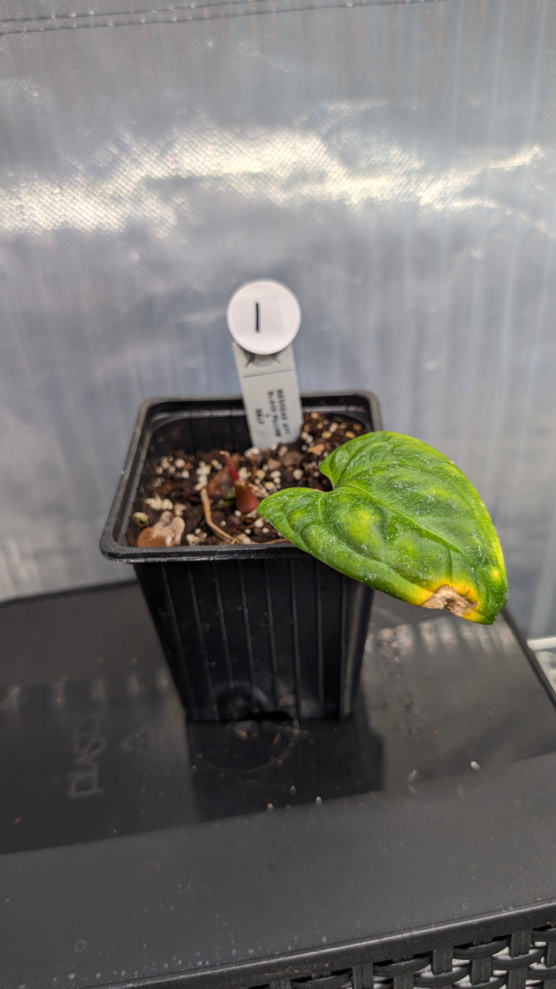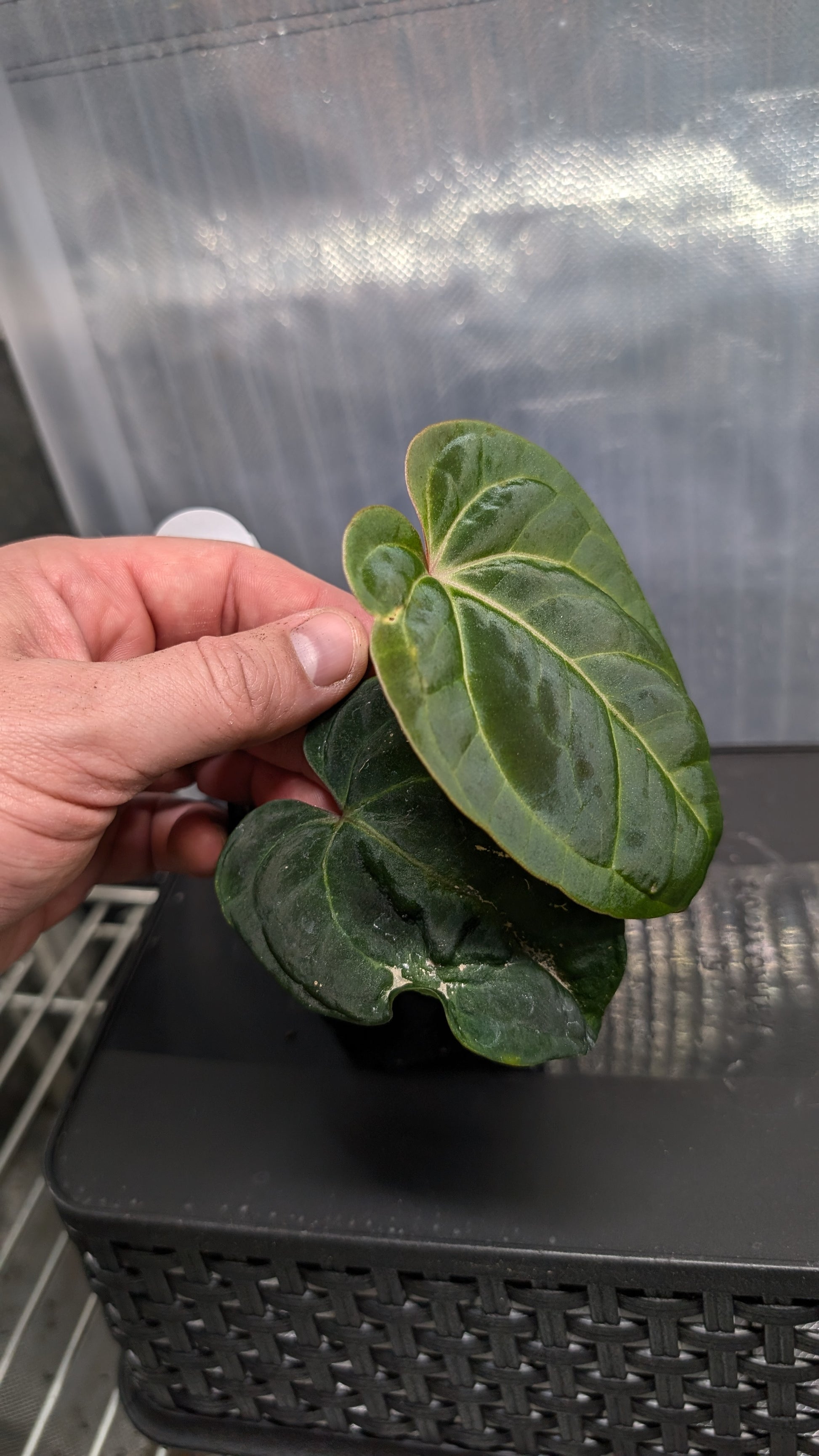Anthurium Besseae aff. is a beautiful Anthurium, but there are many different forms for sale. Some are flat without a lot of texture, some are very 'pillowy'. Some are more green, while some are almost black. This clone has the most desirable traits from both, its hardened leaves are almost black and the leaf surface is very pillowy giving a threedimensional look to the plant, making this a fan-favorite of our collection of mother plants. Emerging leaves (bottom right on first photo) have a lovely red tinge under plenty of light.