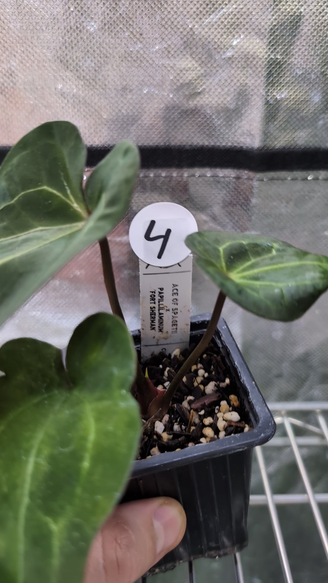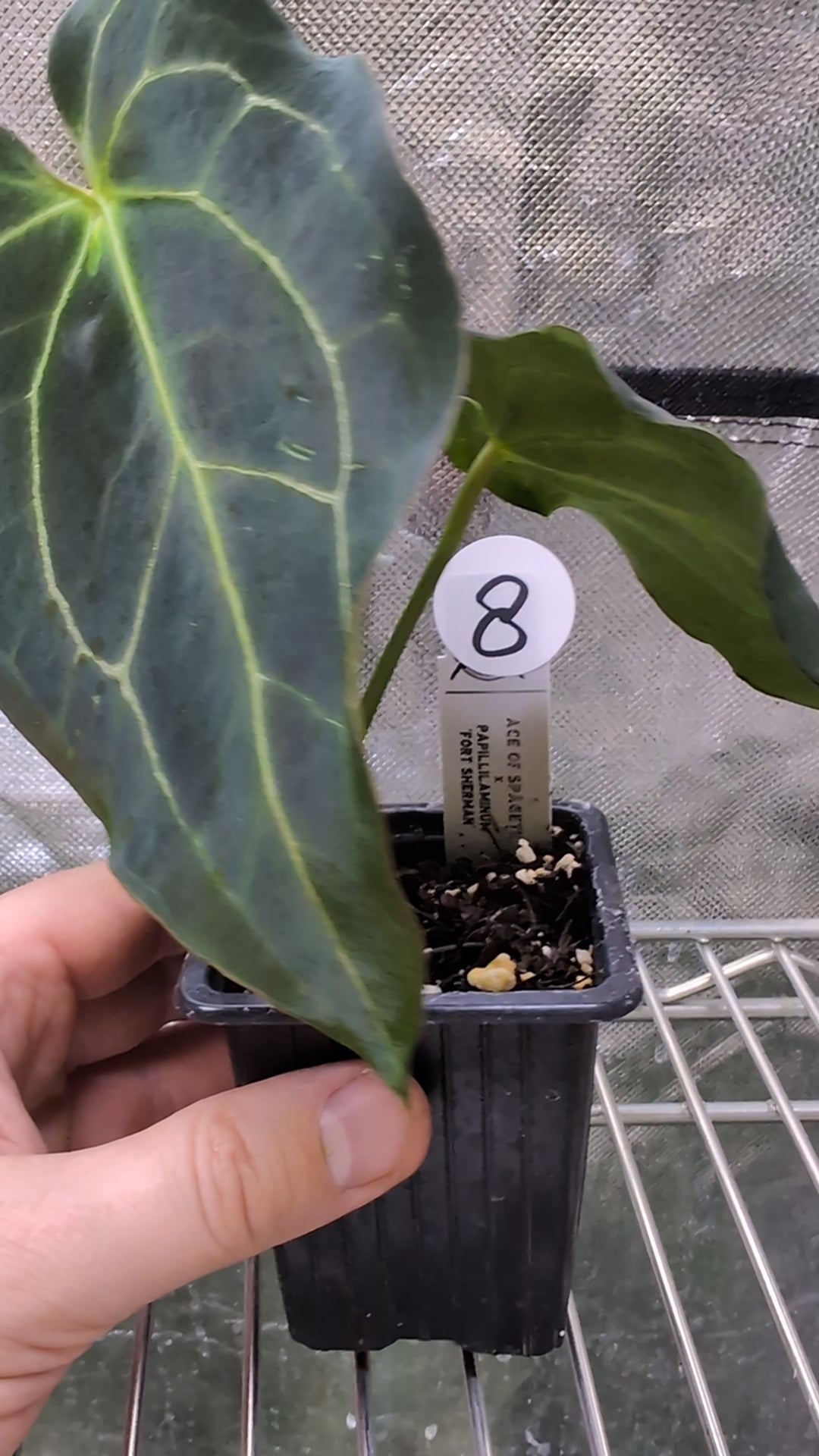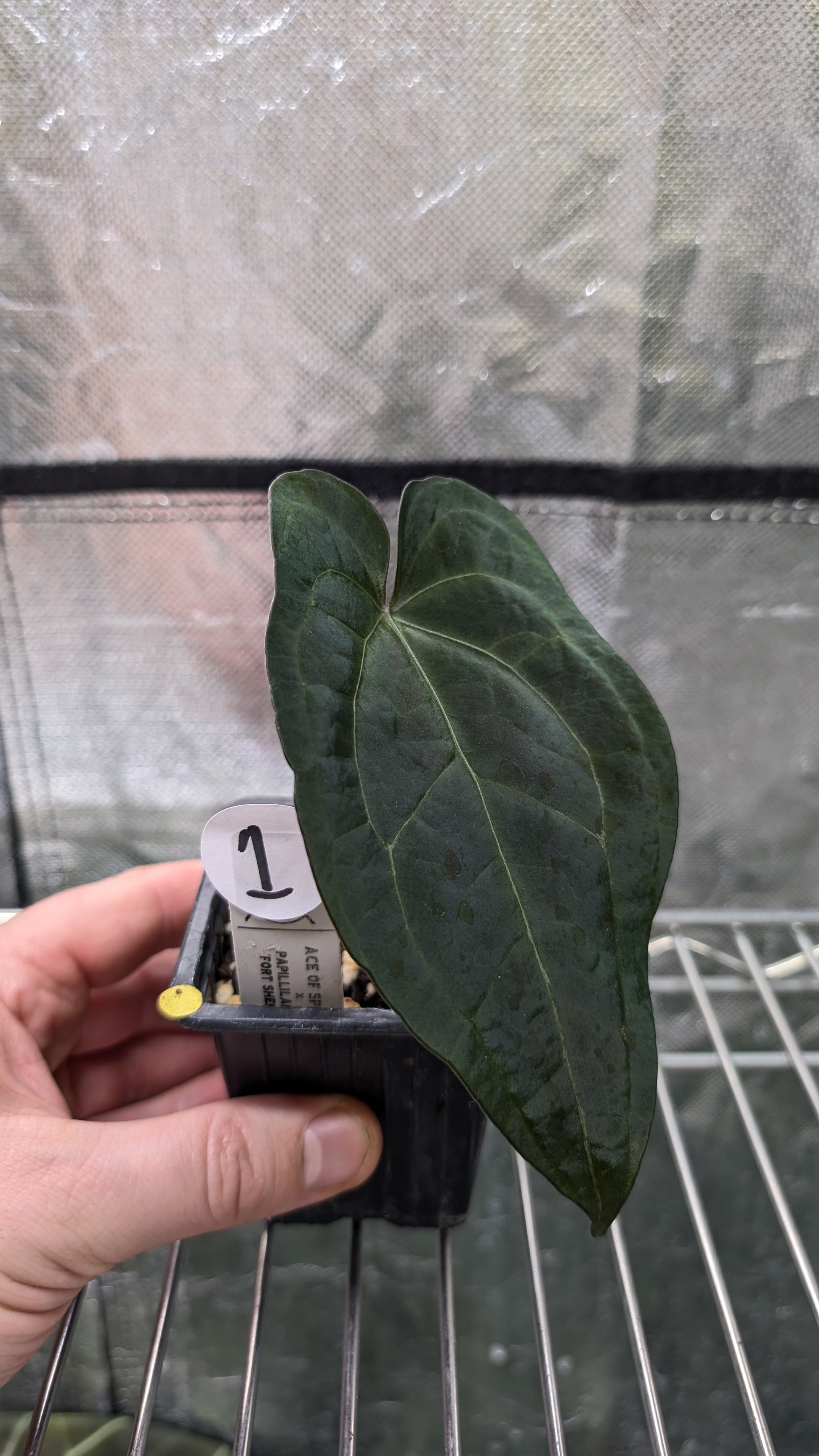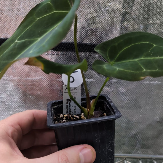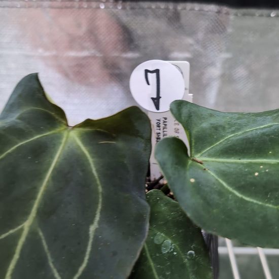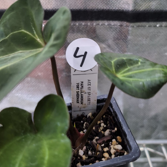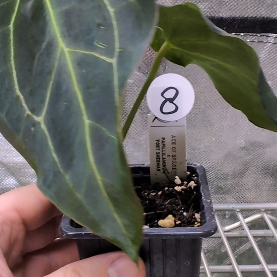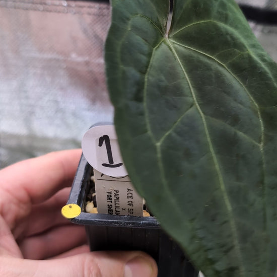 We crossed two of our amazing mother plants, Anthurium Ace of Spades x Anthurium Forgetii dark, lovingly named Ace of Spagetii was the Mother plant. Papillilaminum 'Fort Sherman' was the pollen parent.